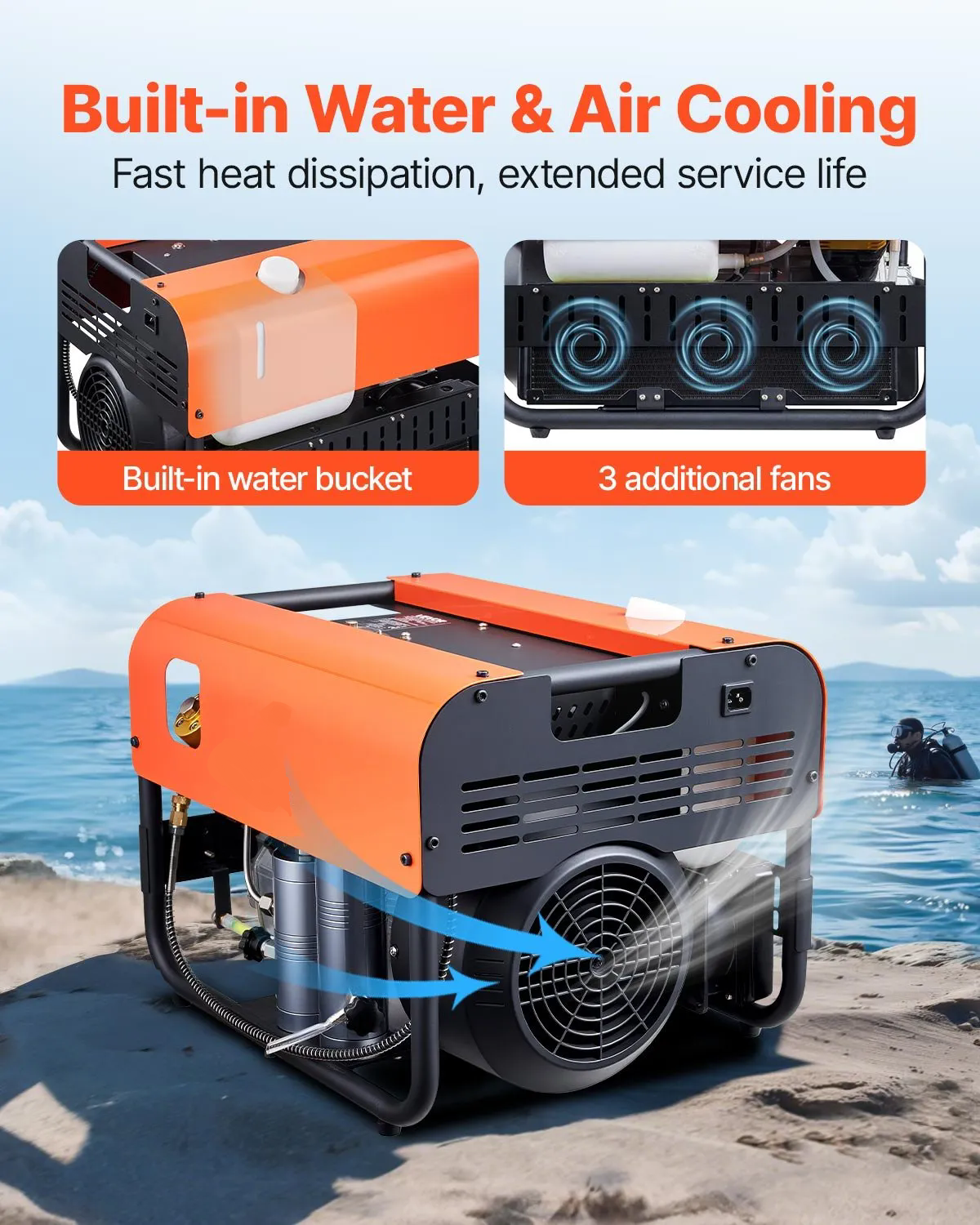The inflating speed: 25 minutes (200 bar /0.5 liter) 40 minutes (200 bar/6.8 litre)Noise: 68 DB